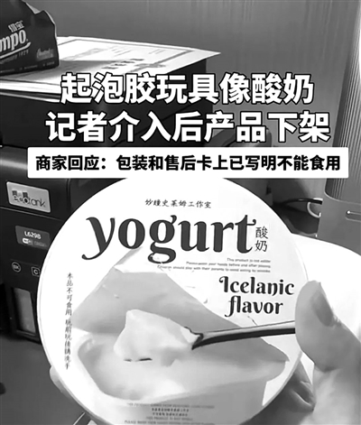 搜索发现,这款产品宣传图片上,有“风味酸奶”字样,包装封面画有开盖酸奶和勺子,只在包装左边和底部写了一行小字,“本品不可食用,玩前玩后请洗手”。