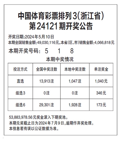 中国体育彩票排列3(浙江省) 第24121期开奖公告