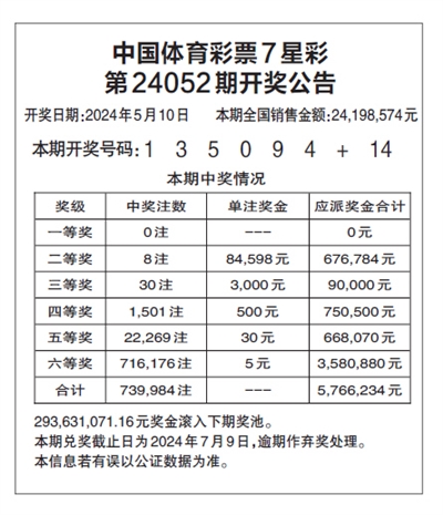 中国体育彩票7星彩 第24052期开奖公告