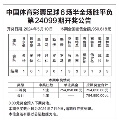 中国体育彩票足球6场半全场胜平负 第24099期开奖公告
