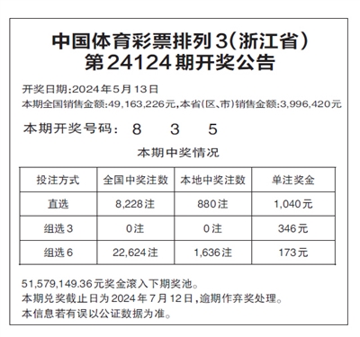 中国体育彩票排列3(浙江省) 第24124期开奖公告