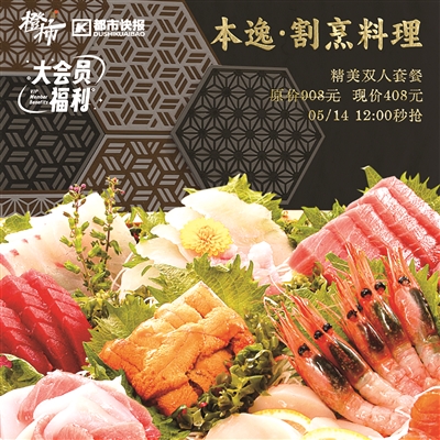 本逸·割烹料理精美双人套餐,原价908元,现价408元,共10份在橙柿互动秒抢。大家可登录橙柿互动App,在“活动”频道找到相关文章参与秒抢。