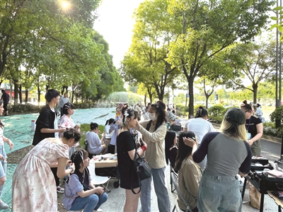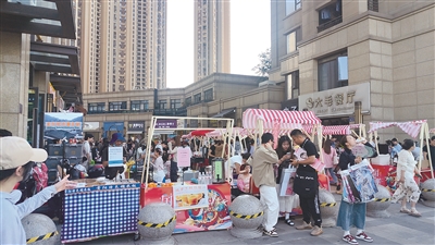 小区东北侧门口有一些粉丝周边的摊位,生意也不错,吸引了不少来听演唱会的歌迷来逛。有些女孩头上和脸上都戴着粉丝标记的周边饰品,美滋滋地做着美甲,编着头发,等待开场。