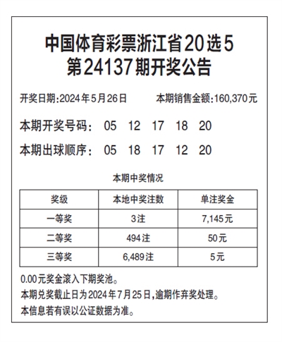 中国体育彩票浙江省20选5 第24137期开奖公告