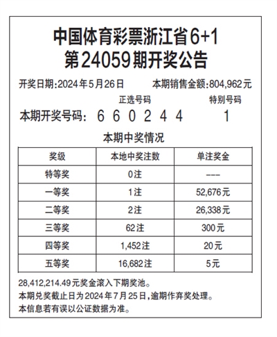 中国体育彩票浙江省6+1 第24059期开奖公告