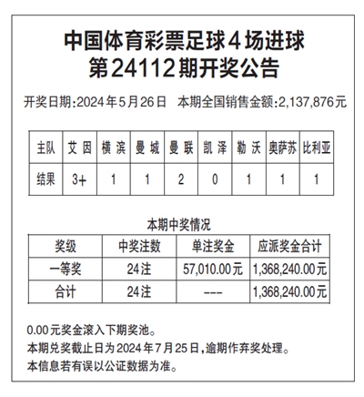 中国体育彩票足球4场进球 第24112期开奖公告