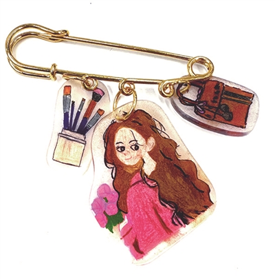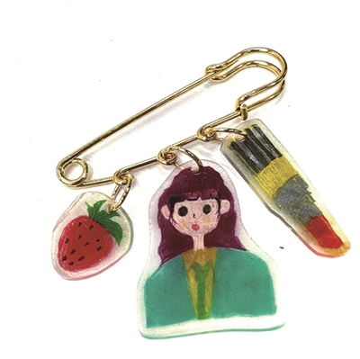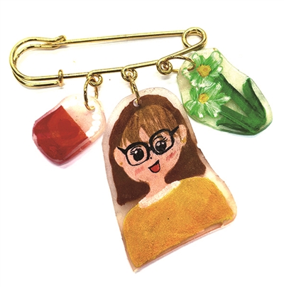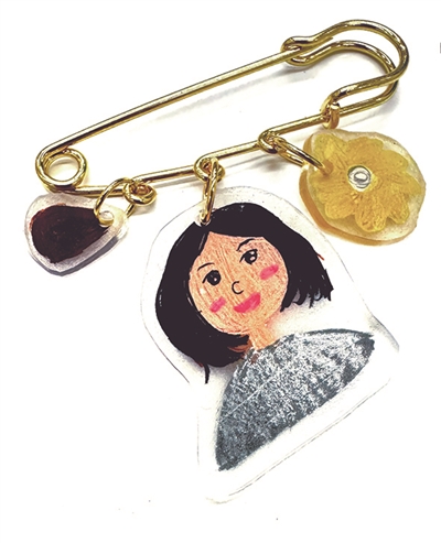 “我的妈妈经常用卷发棒把头发弄得卷卷的,我觉得这样也很好看,于是将她卷发的样子做成了胸针,她平时还爱吃菠萝,喜欢小狗狗。” 插画狮:杭州三之三幼儿园中b班 俞一凡