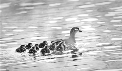 “看到小鸳鸯,也需要运气的。这次的发现者是徐先生,当天他在华家池边散步,走到一棵柳树边,突然从草地里跑出1只大鸳鸯和9只小鸳鸯,发出细小的叫声,然后接连跳进水里。”
