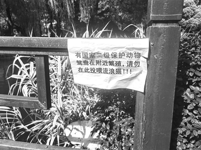在通往湖心岛的桥上有一张告示:有国家二级保护动物鸳鸯在附近繁殖,请勿在此投喂流浪猫。