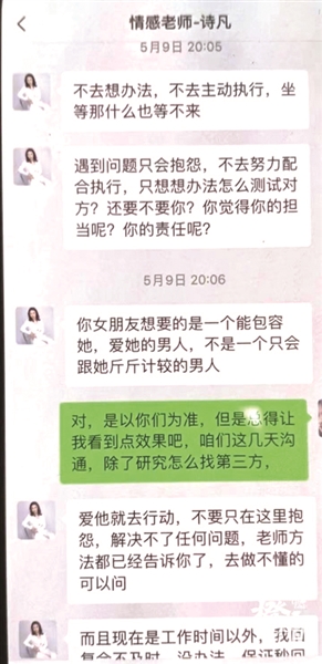 服务期间,“导师”一直像知心朋友一样,安抚着余先生的情绪,为他出谋划策。几天下来,前女友并没有回心转意。