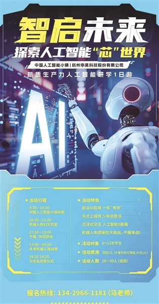 需要提醒的是,小朋友要求年龄在8到12岁,体验名额不含午餐,如有需要可提前预订,餐费30元。家长需在9:30把孩子送到中国人工智能小镇。