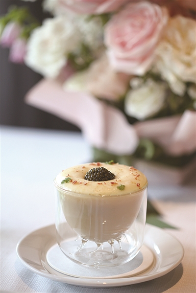 每一季,珀餐厅都会推出午间与晚间两套菜单,现在来看珀餐厅本季的午间菜单都有哪些中西合璧,“菌菇汤舒芙蕾鱼子酱”是按照甜品舒芙蕾的样子制作的一款汤品,拿小勺子往底下深挖,然后一股脑儿送入口中,就能品尝到菌菇汤、土豆泥、鱼子酱的三重转折,丰富多彩。在“香煎法国犬牙鱼,台州小土豆,墨鱼葡萄酒汁”里,台州小土豆只是边上的配角,架不住跟我们的距离近啊,再加上墨鱼汁与葡萄酒调制而成的酱汁,充满亲切感。