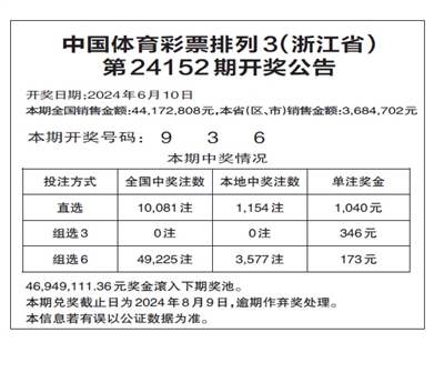 中国体育彩票排列3(浙江省) 第24152期开奖公告
