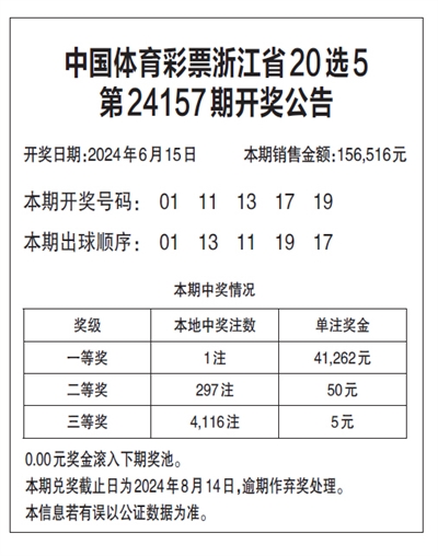 中国体育彩票浙江省20选5 第24157期开奖公告