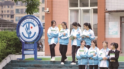 沐川县中等职业学校挂着“蓝鹰工程”的标志,上面是山,代表四川,下面是海,代表浙江,蓝色代表蓝领,蕴含着对孩子们从小鸟长成雄鹰,翱翔山海间的期待。