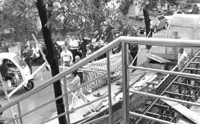 橙友叶女士(化名)告诉记者,6月13日一早,来了4名施工人员,在42幢周边搭起了架子,正在搭模板。8点左右,过来一位大妈,拿出手机打电话说“快来快来……”不一会儿,从楼上下来一位大伯。