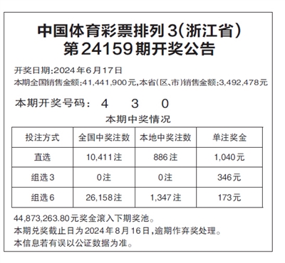 中国体育彩票排列3(浙江省) 第24159期开奖公告