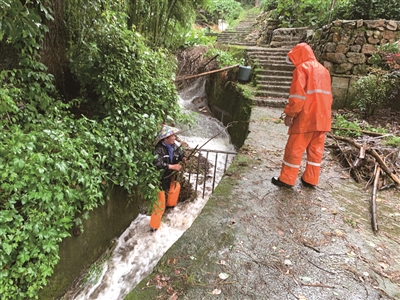 这时,许多身穿雨衣的村民也站了出来,自发加入应急队伍,主动帮忙清理家附近沟渠的垃圾。