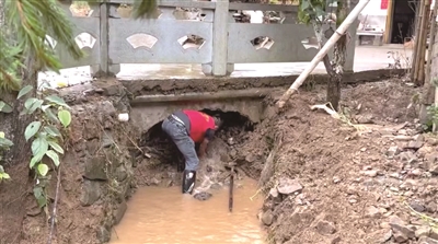 6月22日下午,为了防止山上水流对农户造成进一步的影响,吴立鑫跳下水渠,对堵塞的涵洞进行了清理,确保水流顺畅。“如果不清理,水过不去,就会冲到路面上了。这两天,我们会抓紧把涵洞都给清理了。”他说。