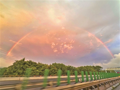 昨天傍晚,雨后日落,嘉兴往杭州方向的高速公路上拍到的彩虹。 记者 陈中秋 摄