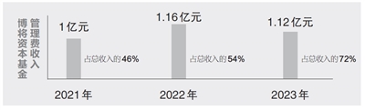 在投资业绩方面,博将资本的表现一直受到市场的密切关注。截至2023年12月31日,公司的投资组合包括91家投资组合公司,其中有80家在高科技产业内运营,涵盖高技术服务、数字信息技术、先进制造与自动化、医药与医疗技术及新材料行业。招股书显示,2021年-2023年,博将资本基金管理费收入分别为1亿元、1.16亿元和1.12亿元,占到博将资本总收入的46%、54%和72%,呈现逐年走高趋势。