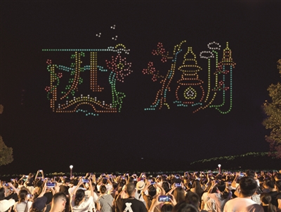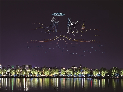 本报讯 7月4日晚,杭州西湖风景名胜区管理委员会联合杭州日报报业集团在西湖音乐喷泉广场献上了一场引人入胜、韵味无穷的无人机表演。