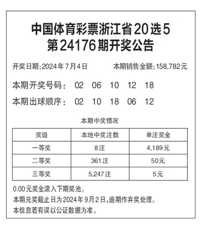 中国体育彩票浙江省20选5 第24176期开奖公告