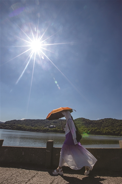 昨天下午,西湖边烈日当头,游客撑着遮阳伞游玩。 记者 陈中秋 摄