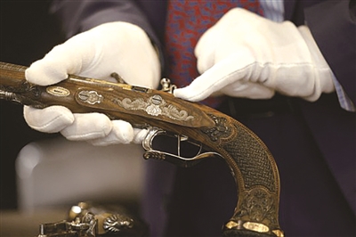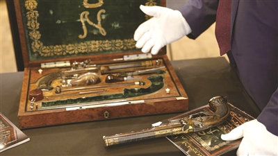 两把枪出自巴黎的枪械制造商路易-马兰·戈塞之手,预估价在120万-150万欧元(约合944万-1180万元人民币)之间。枪身装饰华丽,镶嵌着金银,刻着拿破仑的肖像。