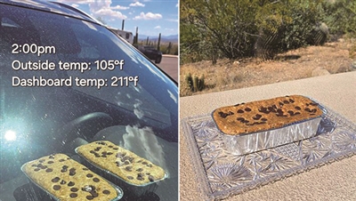 近日,美国亚利桑那州图森市萨瓜罗国家公园的护林员,展示了他们在汽车仪表盘上烤制的香蕉面包。他们通过汽车的仪表盘展示了面包在阳光下烘烤的过程,香蕉面包放在锡锅里,仪表盘温度可高达99.4℃,而外部温度为40.6℃。