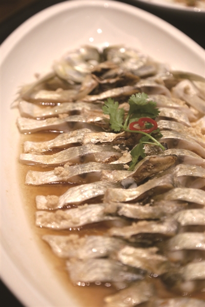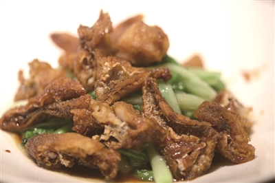 天妇罗臭鳜鱼,已经算是很温柔的了,外部的天妇罗壳松松脆脆的,内部的臭鳜鱼呈现出精致的蒜瓣肉状态,软软嫩嫩的。再往前“臭”一步,是鳓鱼蒸鳓鲞,其实这里用的是同一种鱼,只不过经过了“三抱”腌制的鳓鲞,鱼肉变得软乎乎、粉渣渣的,还散发出霸道的鱼臭味。这个臭味,是很多老杭州夏天的开胃密码。插播一下,同样是鲞,马友咸鱼炒蟹就要和淡几分,这个菜有点像是肉骨蟹里加了马友咸鱼,强调了它的咸鲜味。