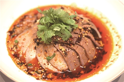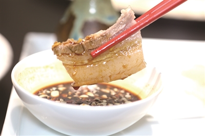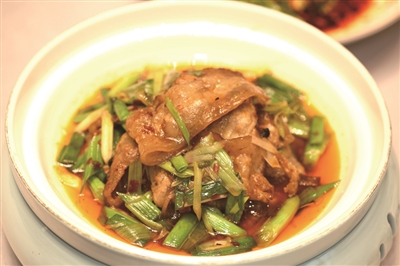 我们熟悉的川菜经典都来了,只不过以前看到、吃到的比较像江湖菜,到了国宾馆它们变得精致了,而且也有了创新与升级。像麻婆豆腐就上升到麻辣辽参豆腐捞饭的高度,考虑到它的重口味,特意在旁边的荷叶上摆了小小的一口米饭,跟辽参、豆腐拌着吃就很好,要不然也可以搭配小烧饼。川味回锅肉用的是金华两头乌的五花肉,先煮后爆炒,加入川味特色的豆瓣酱等调料,老大一片,吃来鲜嫩。
