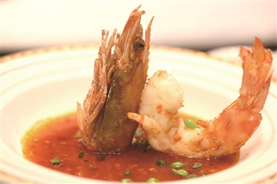 夏季菜单的冷菜是浙、川两地的经典融合,西子宾馆做的杨梅酒醉膏蟹、红珠山宾馆做的夫妻肺片都香出自己的特色。后面出场的也不是每道菜都辣,川菜中的国宴菜鸡豆花温润细腻,鱼香肉丝在这里变身为鱼香大对虾,很有点杭州菜的味道呢。