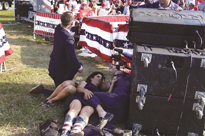 现场传来多声枪响,麦克风能听到有人连声喊:“趴下,趴下,趴下。”数名特勤局特工组成“肉盾”围住特朗普,将他压在地面,特朗普右耳和脸颊上有血迹。