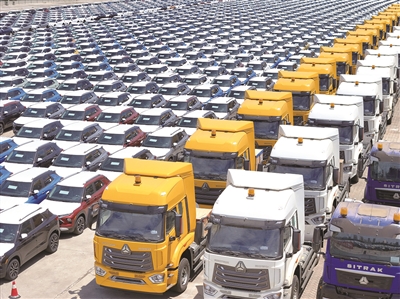 6月19日在山东港口烟台港拍摄的出口汽车(无人机照片)。据新华社