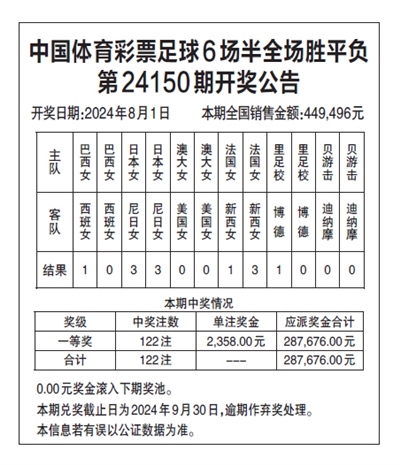 中国体育彩票足球6场半全场胜平负 第24150期开奖公告