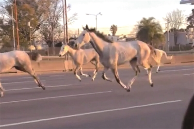 近日,阿根廷五月营区的46匹战马因围栏破损意外跑出。这些马匹刚刚参加完在巴勒莫举办的农村博览会的阅兵表演。事故发生在7月29日下午6时20分,这些马匹进入202号公路和泛美公路,与车辆并行了约8公里。
