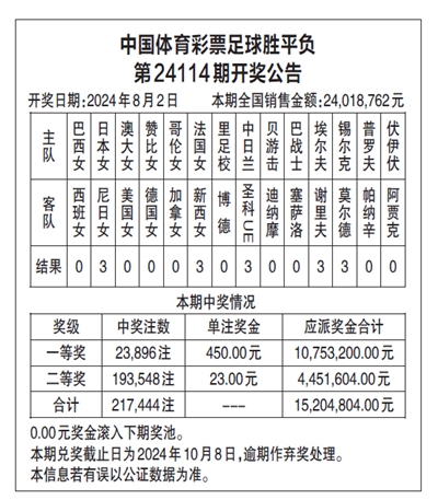 中国体育彩票足球胜平负 第24114期开奖公告
