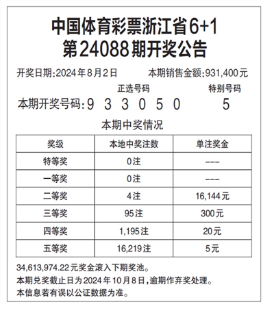中国体育彩票浙江省6+1 第24088期开奖公告