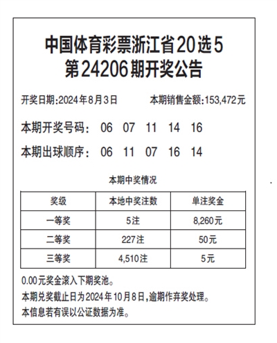 中国体育彩票浙江省20选5 第24206期开奖公告