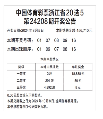 中国体育彩票浙江省20选5 第24208期开奖公告