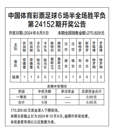 中国体育彩票足球6场半全场胜平负 第24152期开奖公告
