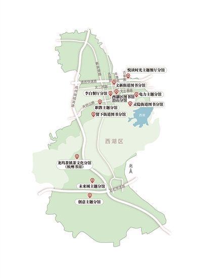 西湖区图书馆还把分馆“搬”到了社区、酒店,甚至企业里。莲花街上的李白图书馆餐厅,就是与西湖区图书馆共建的创意餐厅,藏书近万册。“电力主题分馆”,就在国网浙江省电力有限公司里。“未来域主题分馆”,就在转江街228号保利公寓-人才家苑南门的咖啡馆内。