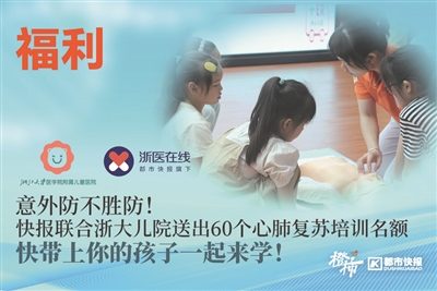 为让更多的家长和孩子学会应急时的心肺复苏抢救,都市快报联合浙大儿院推出心肺复苏免费培训项目。培训结束后,会送出参与培训的纪念证书。