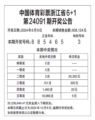 中国体育彩票浙江省6+1 第24091期开奖公告