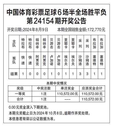 中国体育彩票足球6场半全场胜平负 第24154期开奖公告