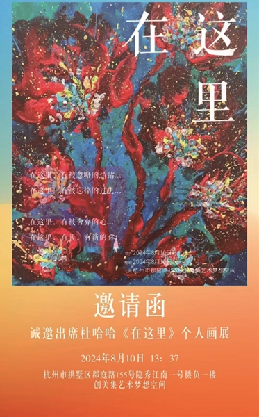 8月10日,在杭州市郡庭路155号创美集艺术梦想空间,青年艺术家杜哈哈《在这里》个人画展亮相,展览将持续一个月。杜哈哈曾是一位传统媒体人,一直热爱绘画,近几年转型专攻画画,维系热爱、寻求内心平静。其绘画以丙烯材料为主。在调色板上混合各种各样的颜色,将满是颜料的笔刷在画布上涂抹,作品色彩明快而鲜艳。