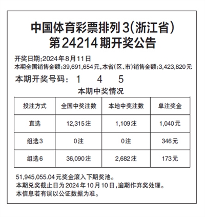 中国体育彩票排列3(浙江省) 第24214期开奖公告