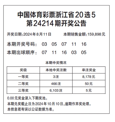中国体育彩票浙江省20选5 第24214期开奖公告