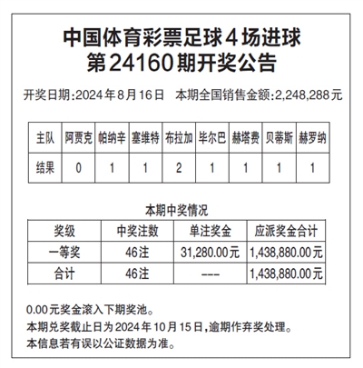 中国体育彩票足球4场进球 第24160期开奖公告